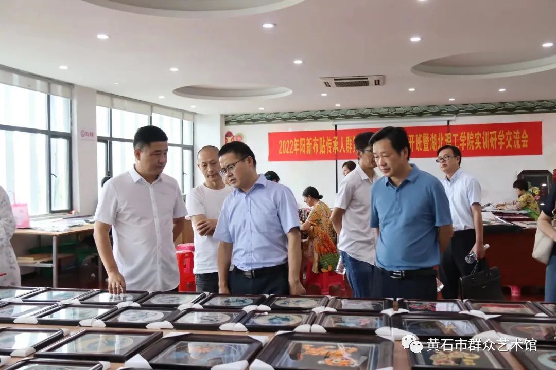 邢君成一行首先来到阳新县文化馆,参观阳新布贴传习所,了解阳新布贴的保护传承情况。对阳新县文化馆在非遗保护传承、带动就业、促进增收等方面作出的积极努力表示肯定。希望能在此基础上坚持“活态传承、持续发展”理念,加大与高校合作,加强文创产品研发,扩大宣传推广。