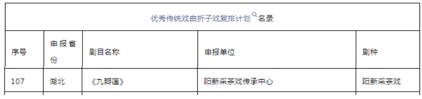 3月21日,文化和旅游部艺术司发布了关于《优秀传统戏曲折子戏复排计划名录》的公示,全国共有305个项目入围,其中,由阳新采茶戏传承中心申报的阳新采茶戏《九瓣莲》